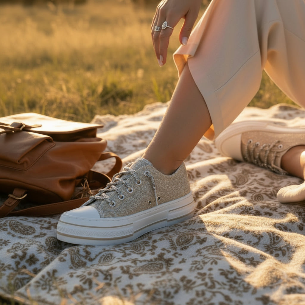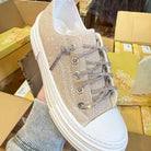 Meet your new everyday favorite. This best-selling sneaker combines comfort, sparkle, and effortless style with a cushioned insole and our signature rhinestone-dusted laces. The 1-inch platform sole adds just the right amount of lift, while the rubber toe guard keeps things practical for all-day wear. Available in multiple colors and patterns, with this camo version being a customer favorite.
