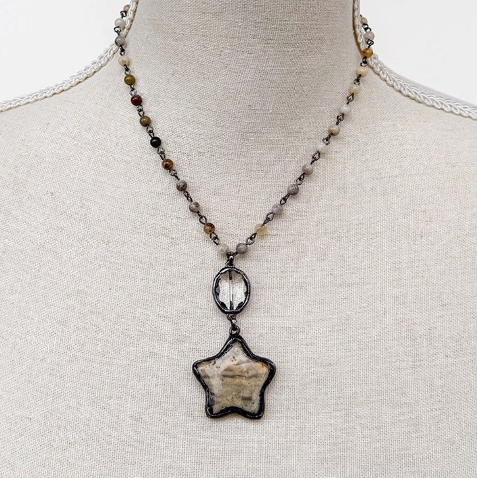 The Ruthie Beaded Star Necklace adds a subtle celestial touch to everyday looks. Featuring a strand of small, natural-toned stone beads, this necklace is finished with a star-shaped pendant that gives it just the right amount of character without feeling overdone. The shorter length makes it perfect for layering or wearing on its own as a soft statement.