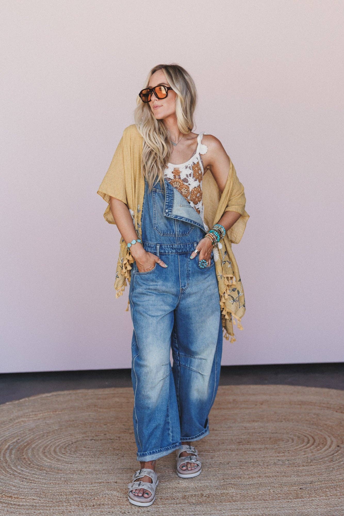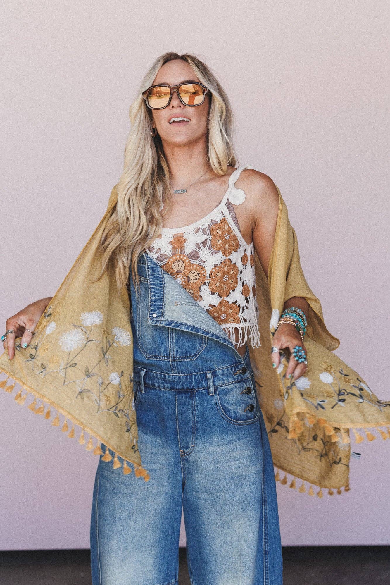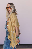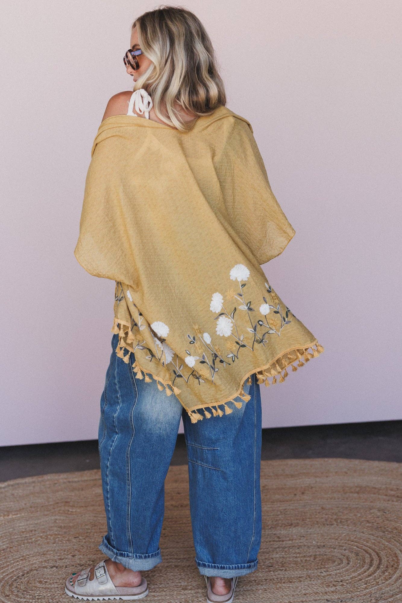 This yellow tassel kimono pairs effortlessly with a tee and jeans for an elevated casual look.
