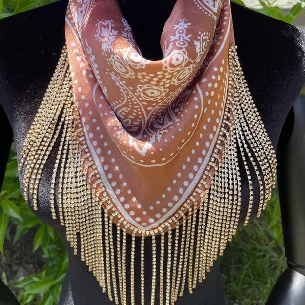 A modern take on the classic bandana. This blingdana features a detailed paisley design finished with cascading rhinestone fringe for movement and shine. Made from a silky polyester blend with a luxe, fluid feel, it’s designed for versatile styling as a neck scarf, headwrap, or statement top.