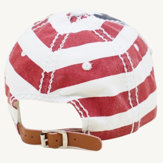This distressed USA baseball cap has that broken-in look from day one. Faded navy, vintage red and white stripes, soft fabric that feels like it’s already lived a little.