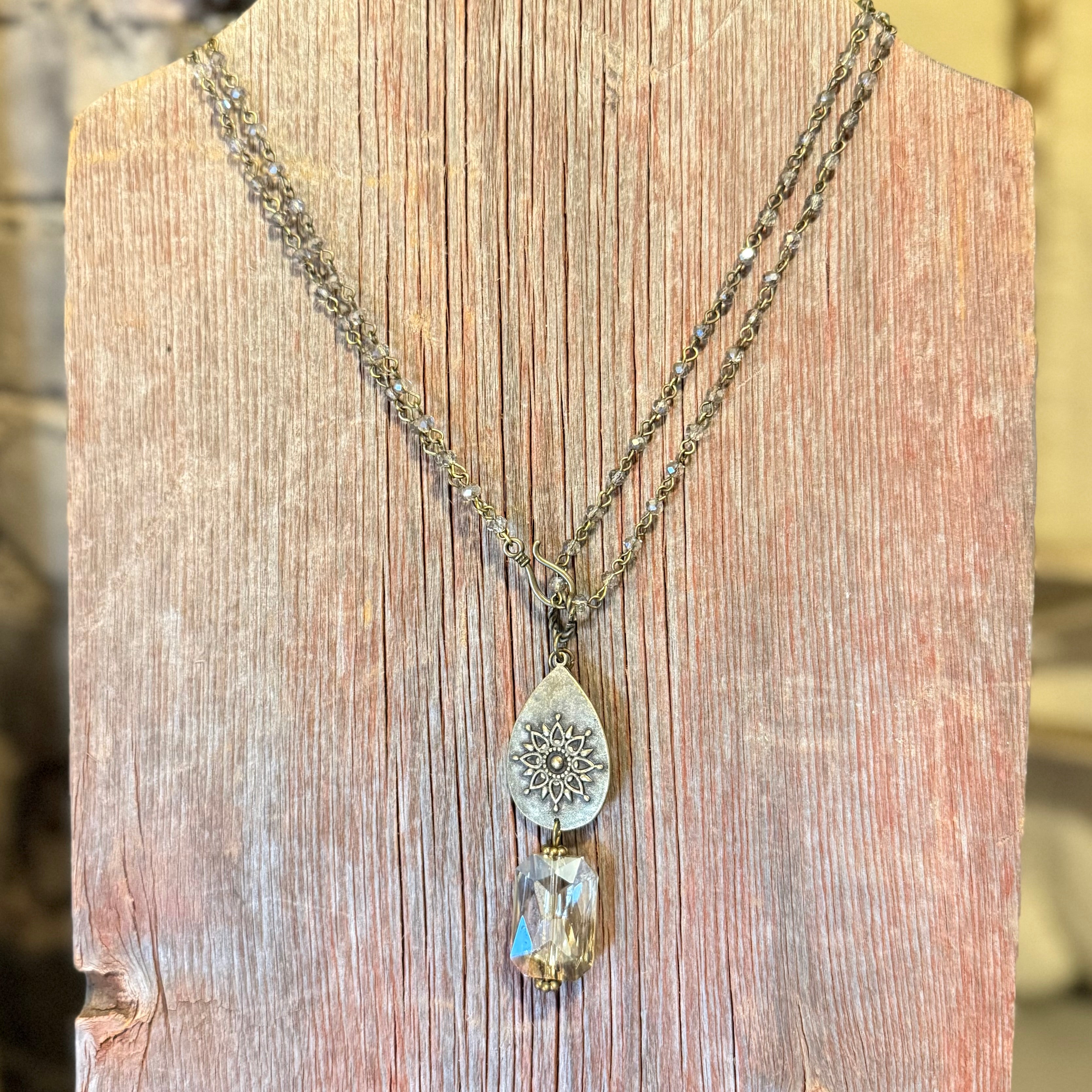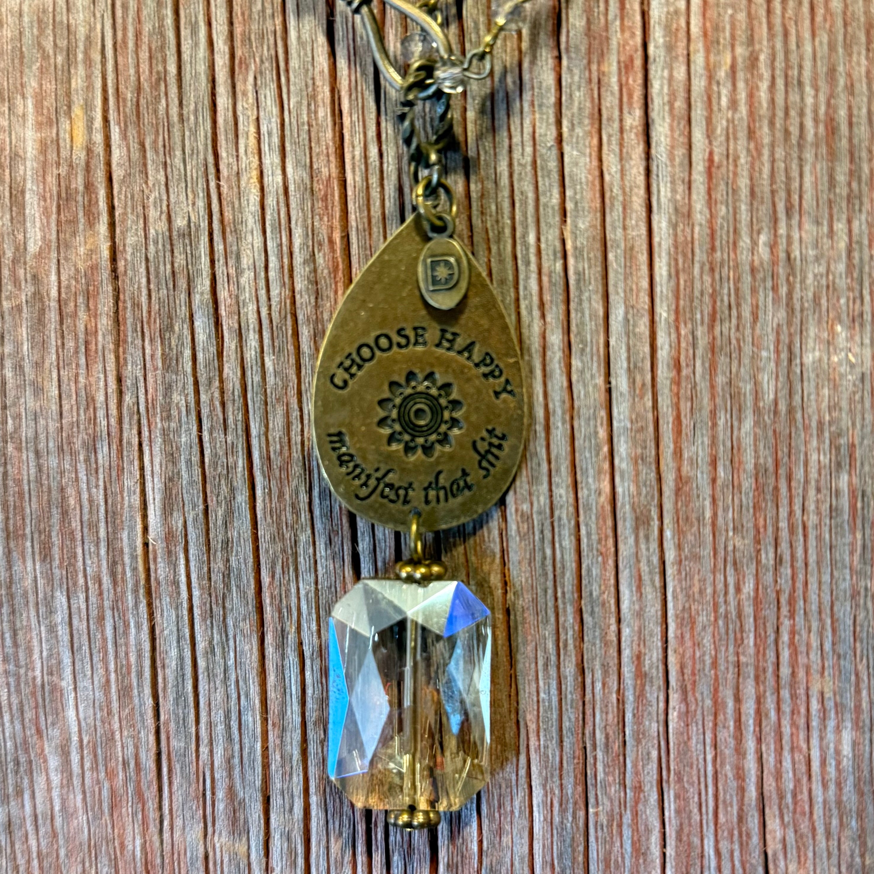 This double-strand necklace features delicate antique-style chains accented with small faceted beads for subtle sparkle. A stamped teardrop charm reads “Choose Happy, Manifest That Shit,” paired with a clear faceted crystal drop that catches the light beautifully. Designed with a lightweight feel and an easy, everyday drape, it layers effortlessly with other favorites or stands on its own as a quiet statement piece.