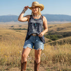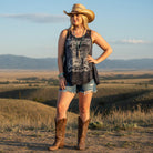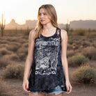 The Midnight Rider Lace Panel Motorcycle Tank features a bold vintage-style motorcycle graphic with skull and wing details that give it that classic outlaw energy. The mineral-washed fabric adds depth and texture, creating that lived-in look that feels like it’s been part of your wardrobe for years.