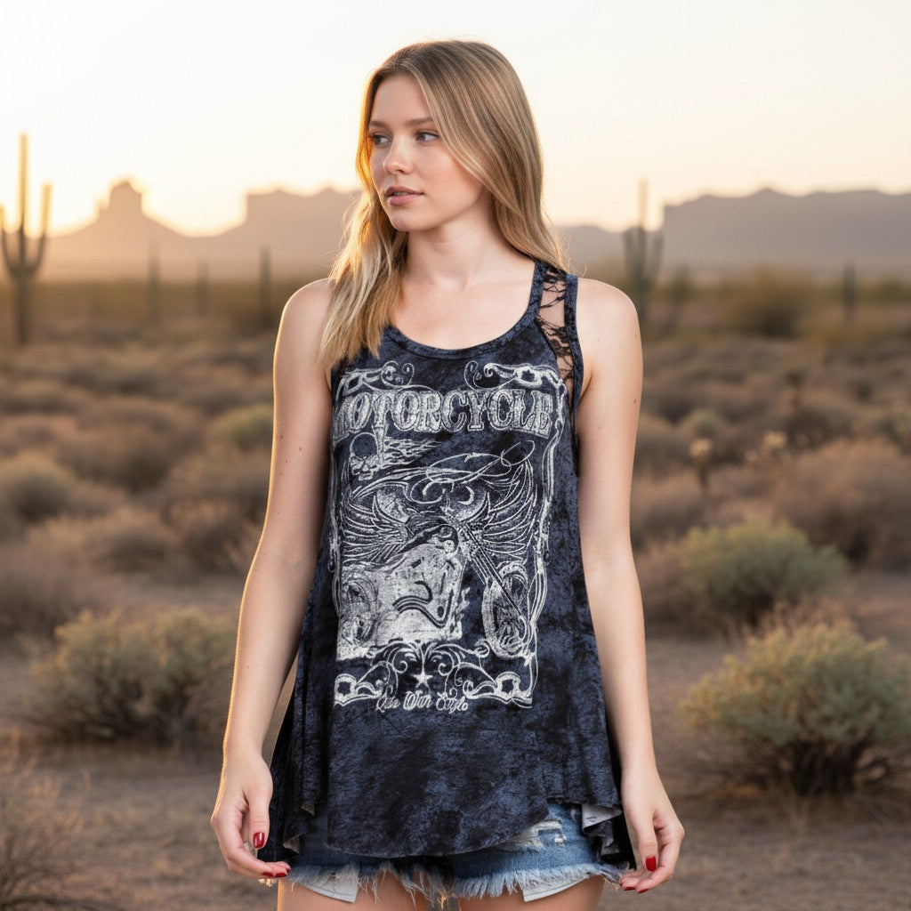 A relaxed motorcycle graphic tank that blends rock-inspired style with feminine lace detailing.
