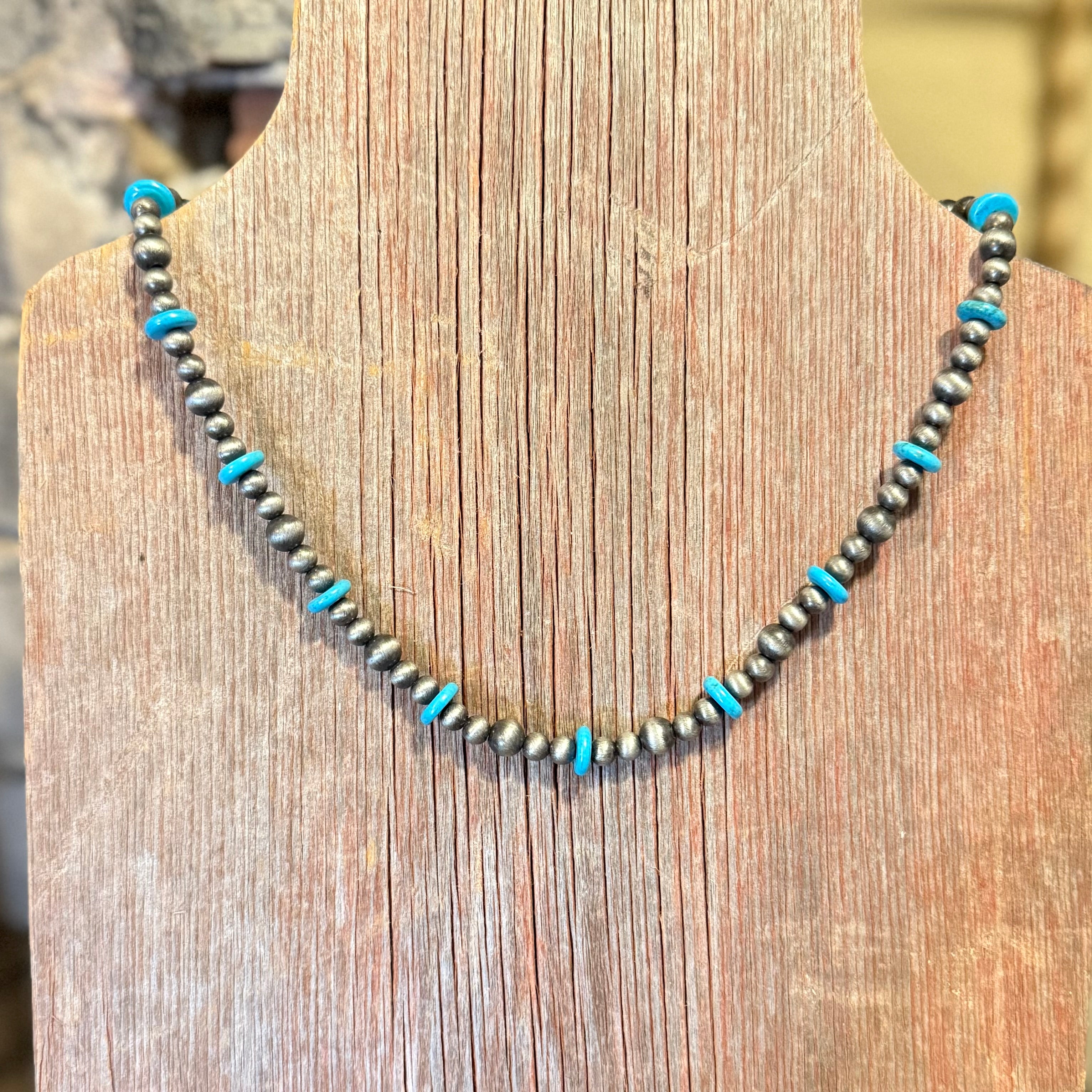 The turquoise brings natural color and variation, while the silver-tone beads give you the iconic Navajo pearl aesthetic in a lightweight, approachable design. This piece is handmade in Texas and meant to feel collected, not precious.