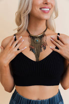 Introducing our Antique Gold Turquoise Fringe Necklace—a captivating blend of vintage charm and modern style. This exquisite necklace features a stunning turquoise centerpiece set in an antique gold frame, exuding timeless elegance. The fringe detail adds a touch of sophistication and movement, making it a versatile accessory for any occasion. Elevate your look with this unique piece that seamlessly marries classic allure with contemporary flair. 40% Zinc 40% Iron 10% Wood 7% Glass 3% Polyester