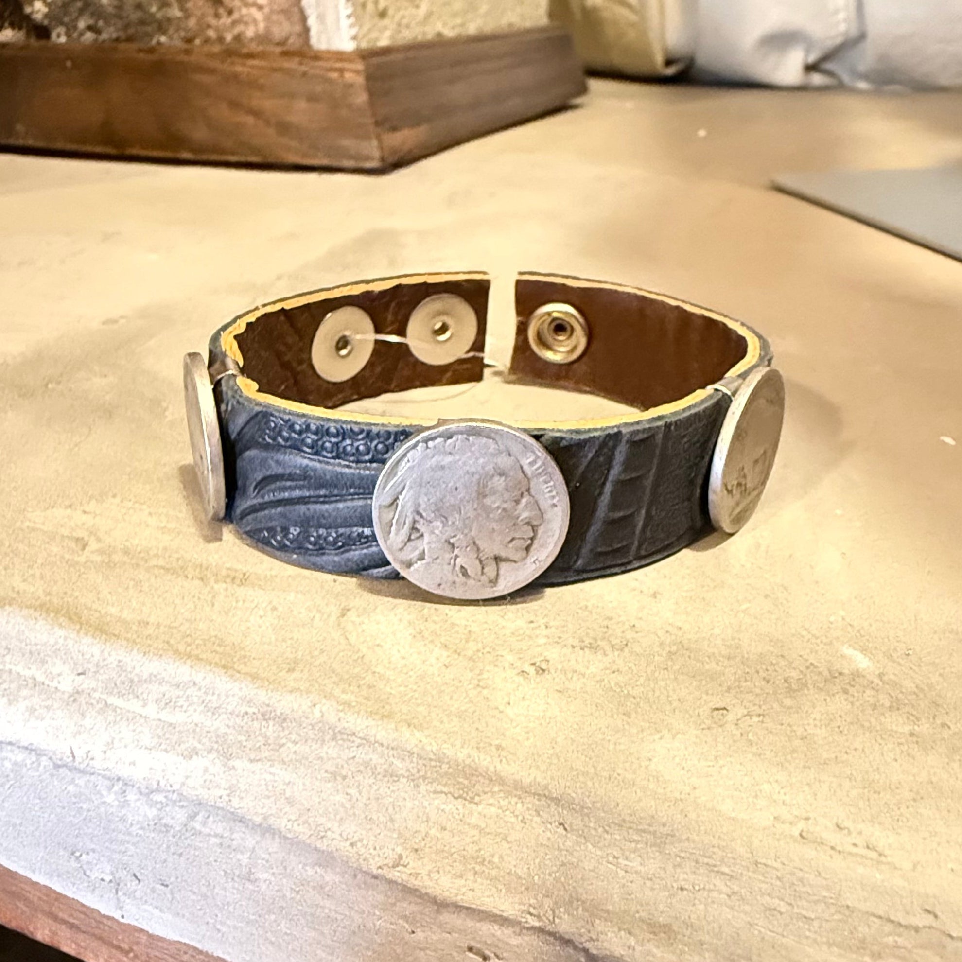 Each buffalo nickel shows natural wear and patina from decades of real life, giving this cuff a presence you cannot fake. Finished with a snap closure for an easy, adjustable fit, it is built to be worn hard and often.