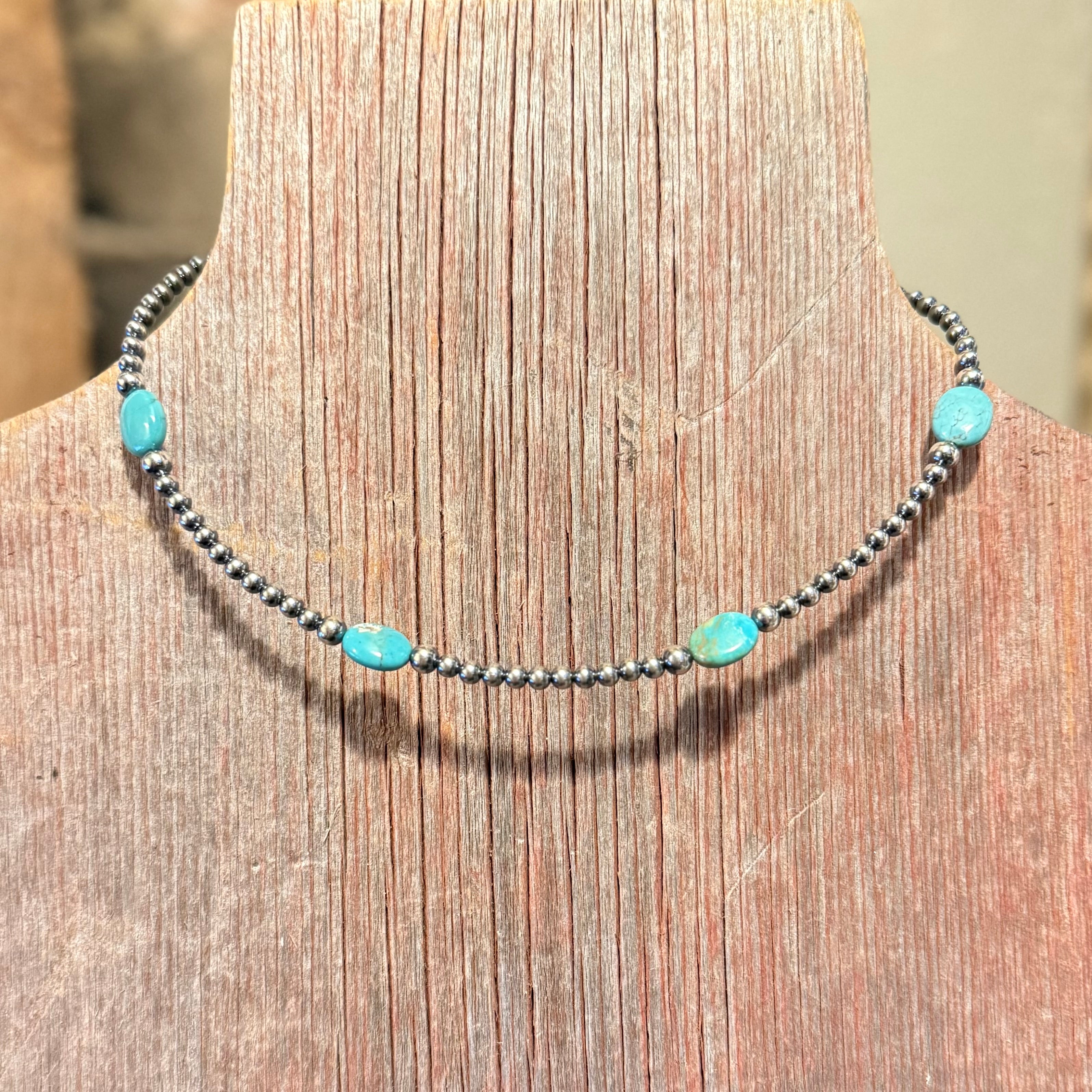 Adjustable from approximately 14–16 inches, this necklace sits beautifully at the collarbone and layers effortlessly with chokers, longer chains, or statement pieces. Crafted with genuine materials and handmade in Texas, each turquoise stone displays natural variation in color and matrix, making every necklace unique.