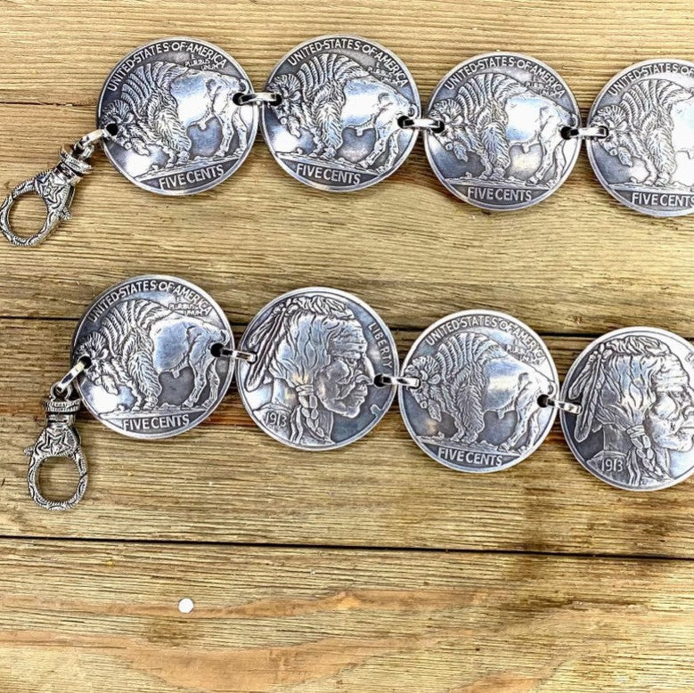 The Buffalo Chief Coin Bracelet is a bold nod to heritage and strength, built with oversized buffalo and Native American chief coins that command attention the second they hit your wrist. Each coin tells its own story, worn and detailed with a time-earned patina that feels powerful, grounded, and unapologetically western.