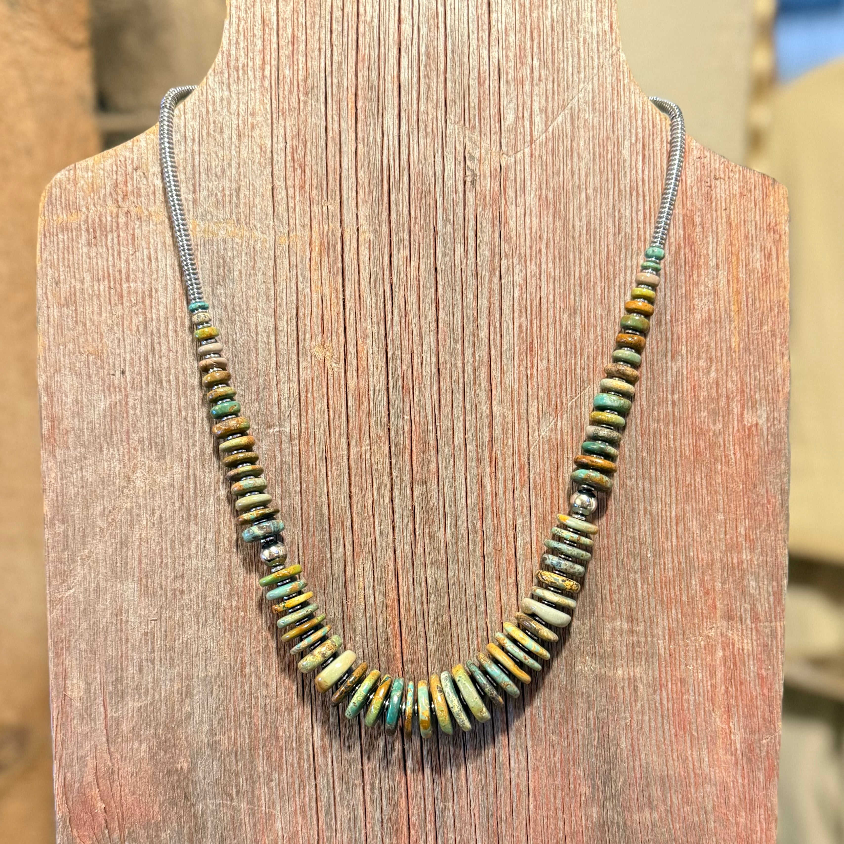 A raw, grounded statement with a lighter silver touch. The Desert Current Turquoise Sterling Silver Pearls Necklace features genuine turquoise heshi beads in natural, earthy tones, accented with just two sterling silver pearls for subtle contrast and balance. The focus stays on the stone. The silver simply punctuates it.