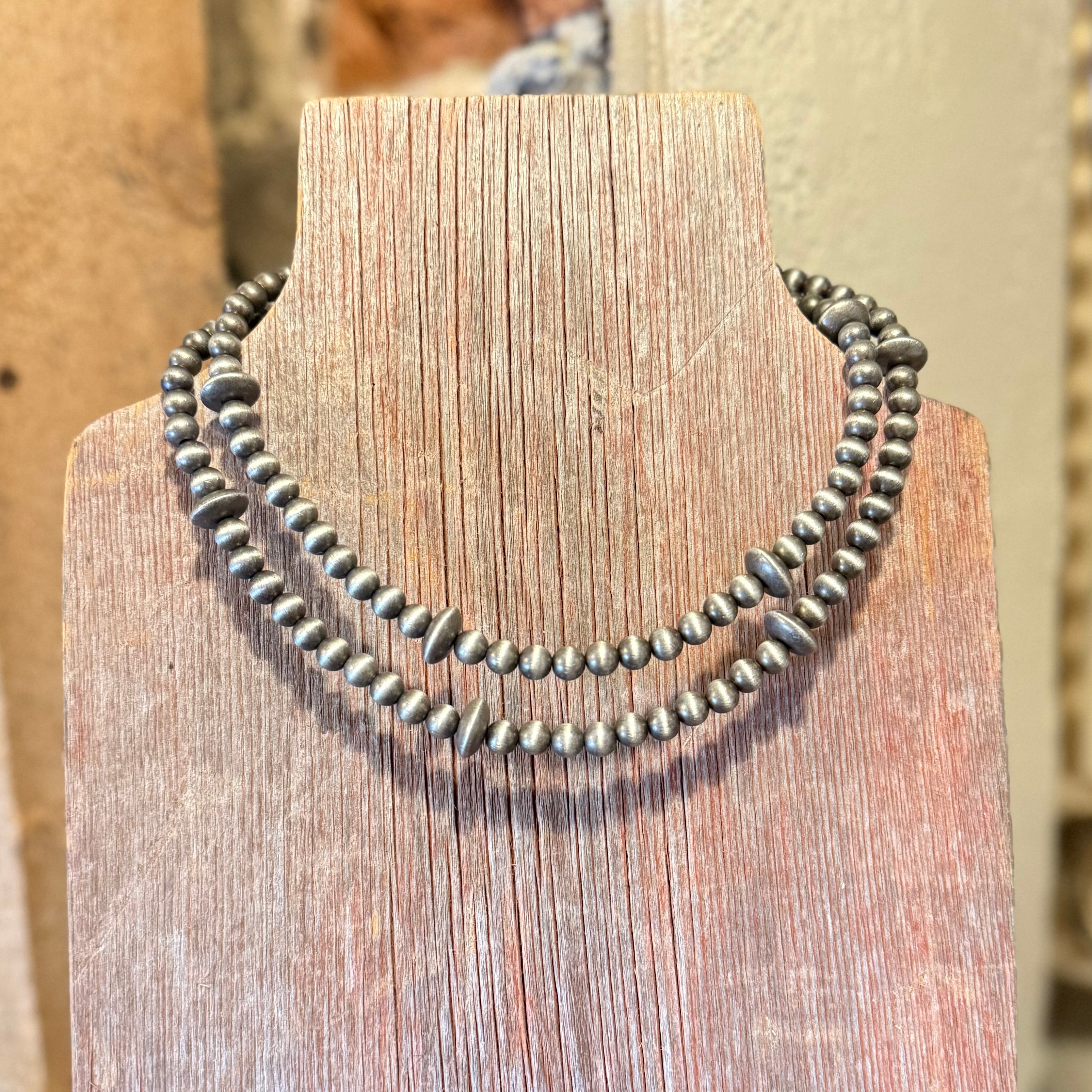 While inspired by traditional Navajo pearls, these beads are silver-tone metal pearls, not authentic Navajo-made sterling, making this piece approachable, versatile, and perfect for everyday wear. The finish has a softly aged look that pairs effortlessly with turquoise, denim, leather, and everything in between.