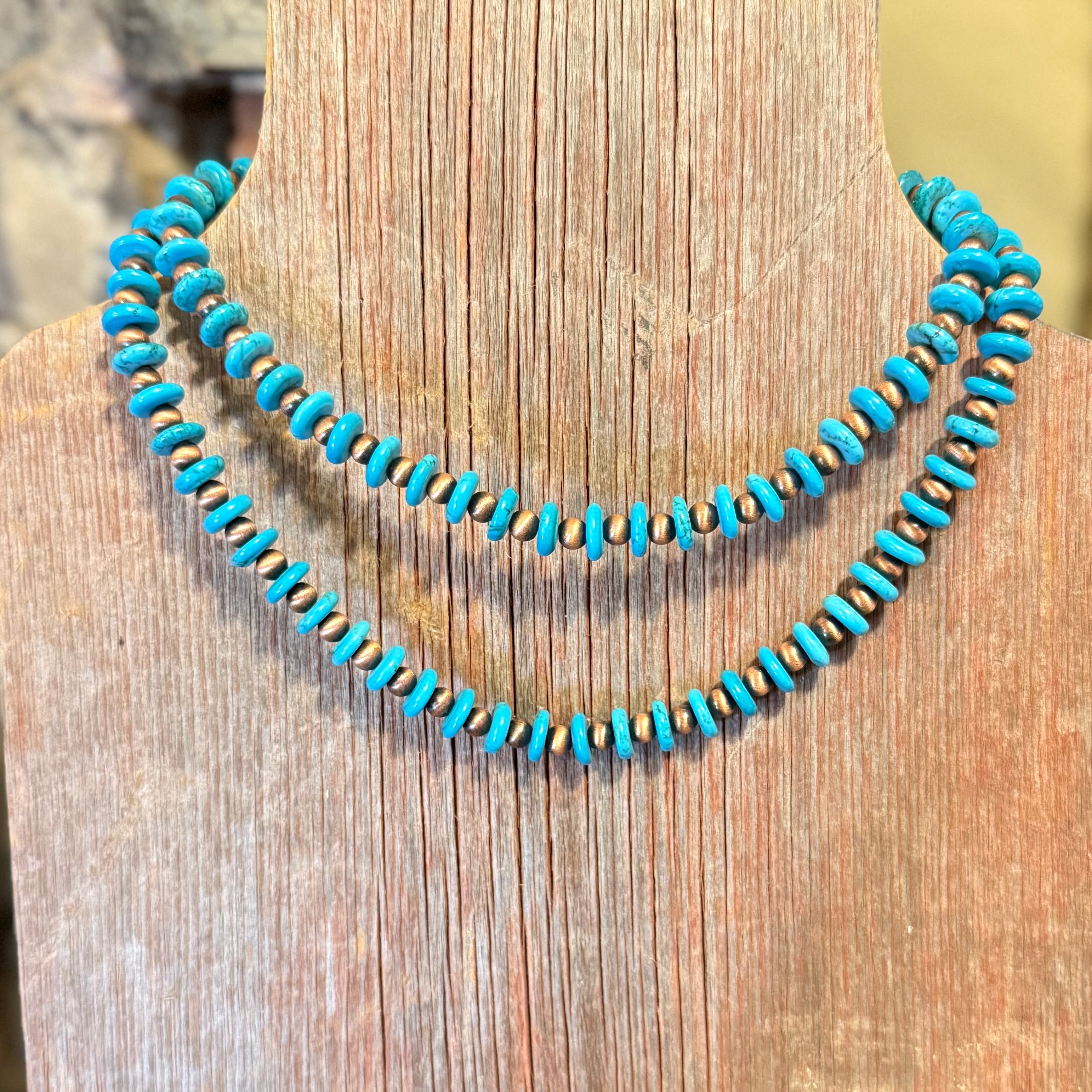 The Juniper Ridge Necklace features genuine turquoise disc beads paired with warm bronze Navajo-style pearls for a look that feels grounded and effortlessly western. The disc-shaped turquoise adds texture and movement, while the bronze beads bring that classic Southwestern weight and warmth without overpowering the stones.