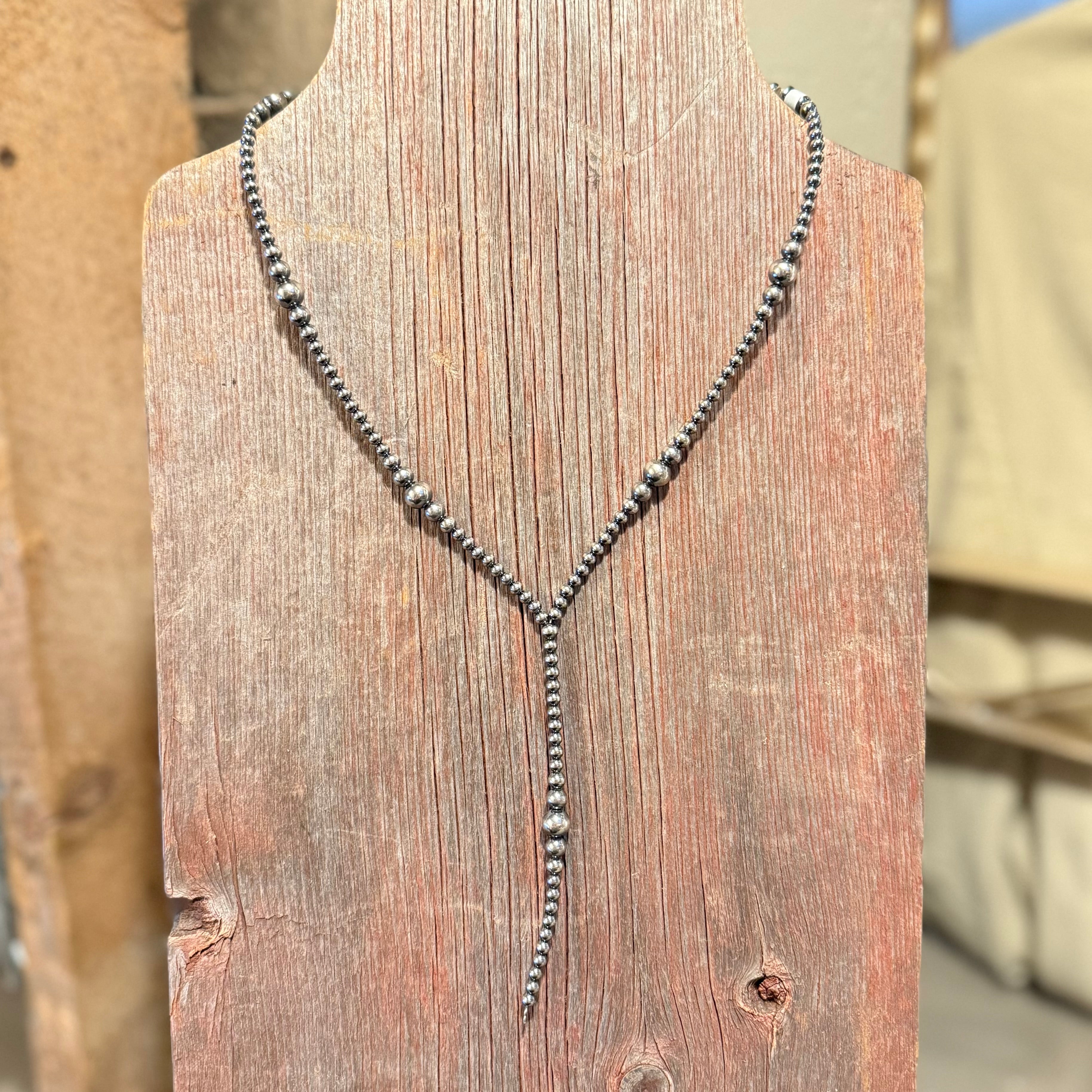 A modern Western classic with clean lines and subtle movement. The Silver Spur Sterling Silver Pearls Lariat Necklace features genuine sterling silver pearls in a refined, graduated design that forms a soft V-shape at the neckline, finished with a delicate lariat drop.
