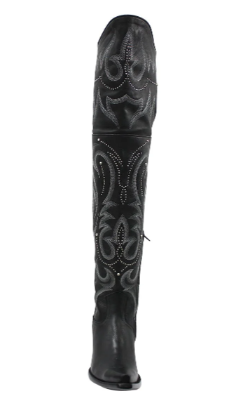 A true showstopper, these stunning 24" over-the-knee Western boots were featured in Cowboys & Indians magazine for their bold silhouette and intricate detailing. Crafted from premium cowhide leather, they offer dramatic height with exceptional comfort and wearability.