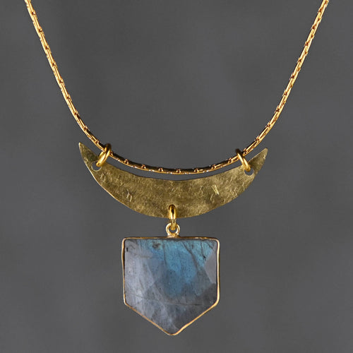 Brass Cast Moon Sliver w/Faceted Crystal Quartz Necklace