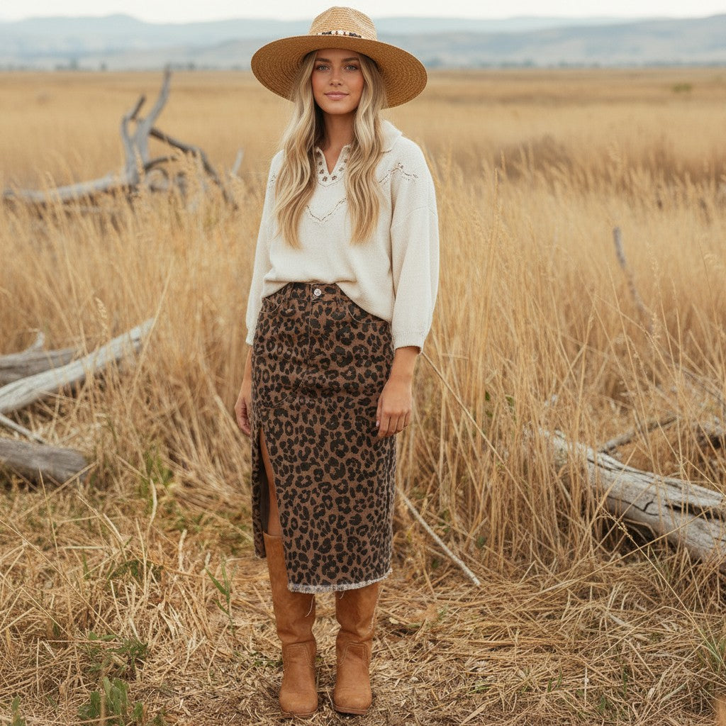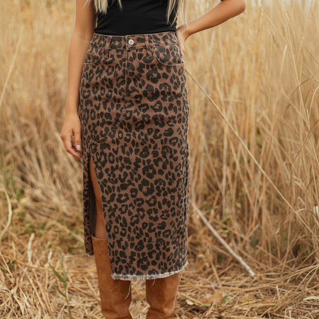 There’s something about leopard in this washed brown that feels quieter than the usual bold print. Still a statement, just a little more grounded. The denim gives it structure, but it’s not stiff. It moves with you, especially with that front slit that makes it easy to walk, sit, live in.