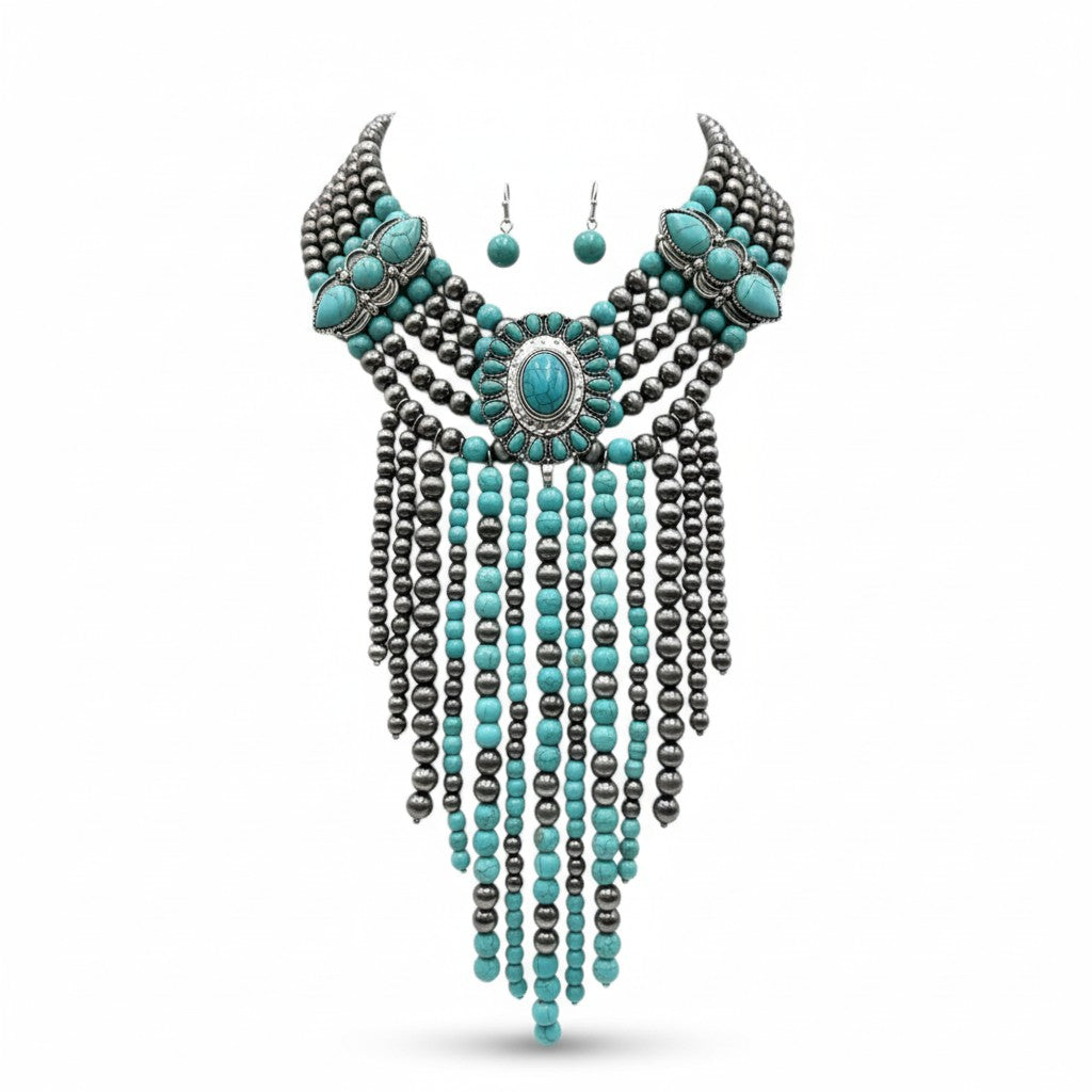Western Fringe Navajo Turquoise Beads Statement Necklace