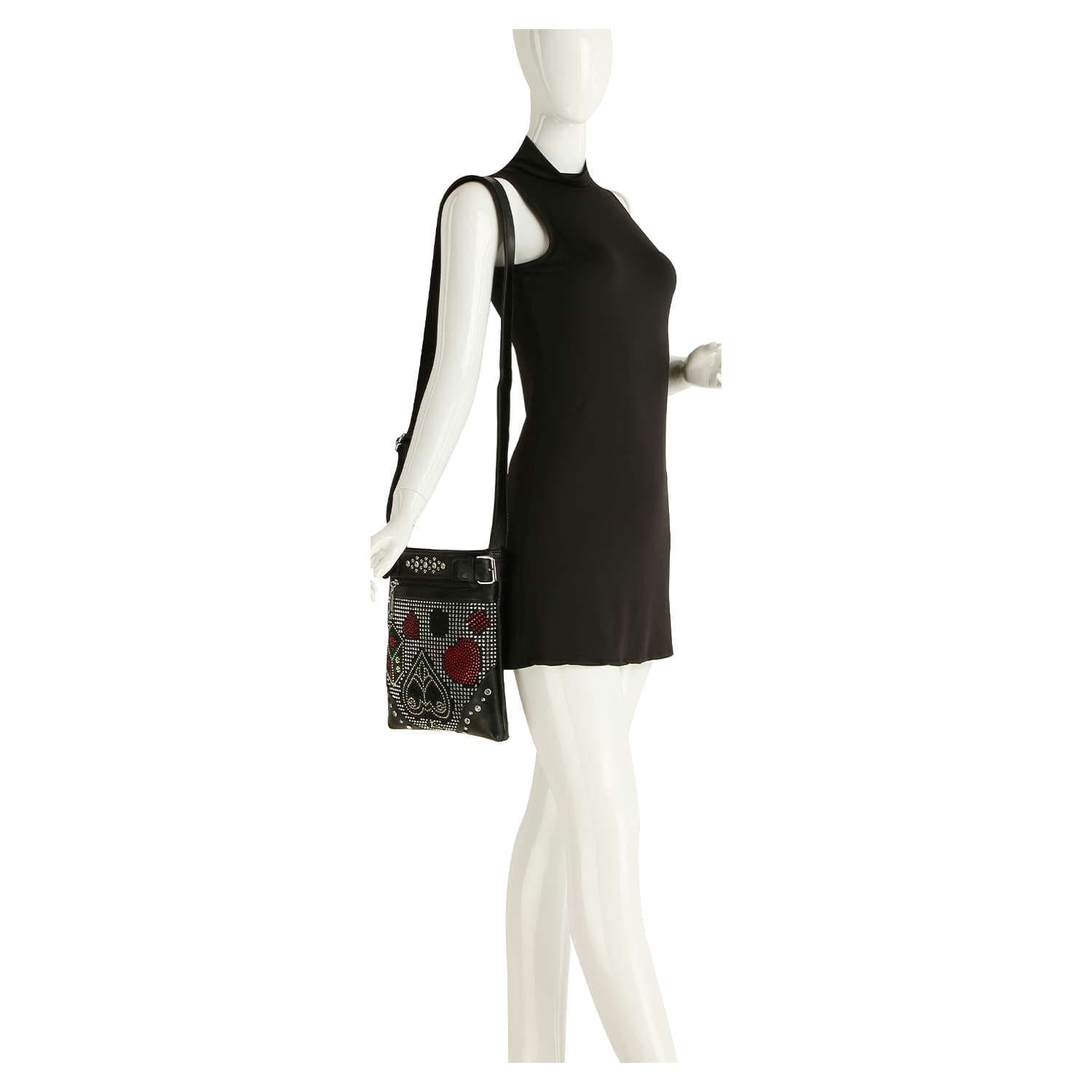Step ahead of the pack with this attention getting sling!! Sparkling rhinestones represent playing cards, such a dramatic fashion statement.
