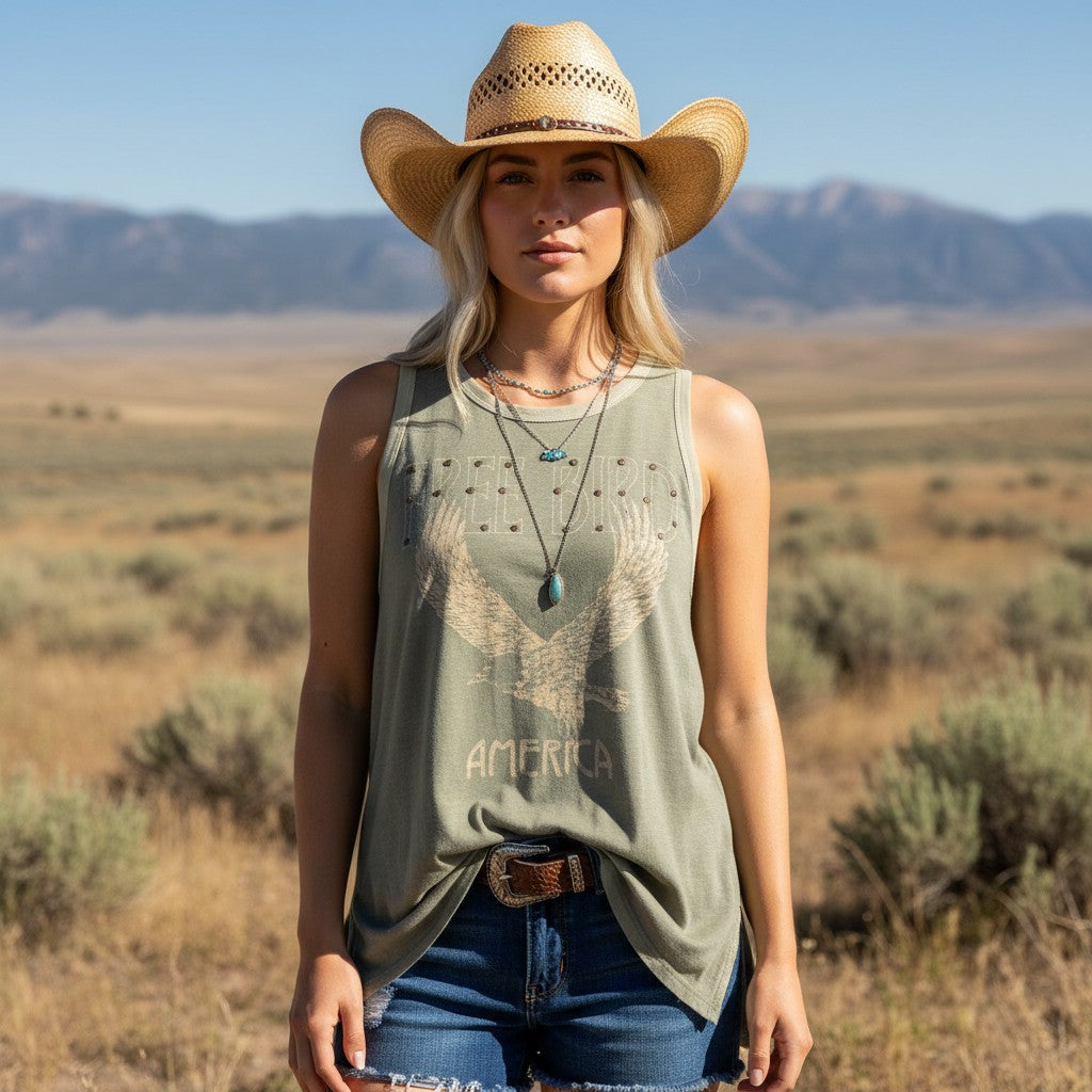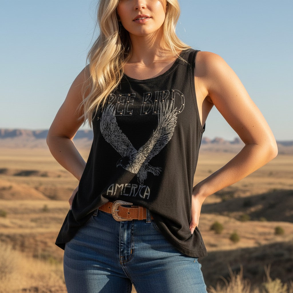 The Free Bird America Studded Graphic Tank features a bold eagle wing graphic with subtle stud accents and “Free Bird” lettering across the front, finished with “America” beneath the wings. It has that worn-in, vintage graphic feel that pairs naturally with denim, boots, and summer nights out.