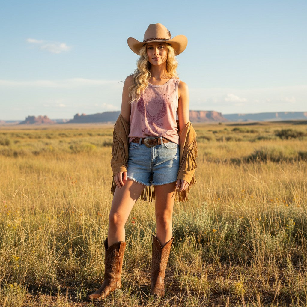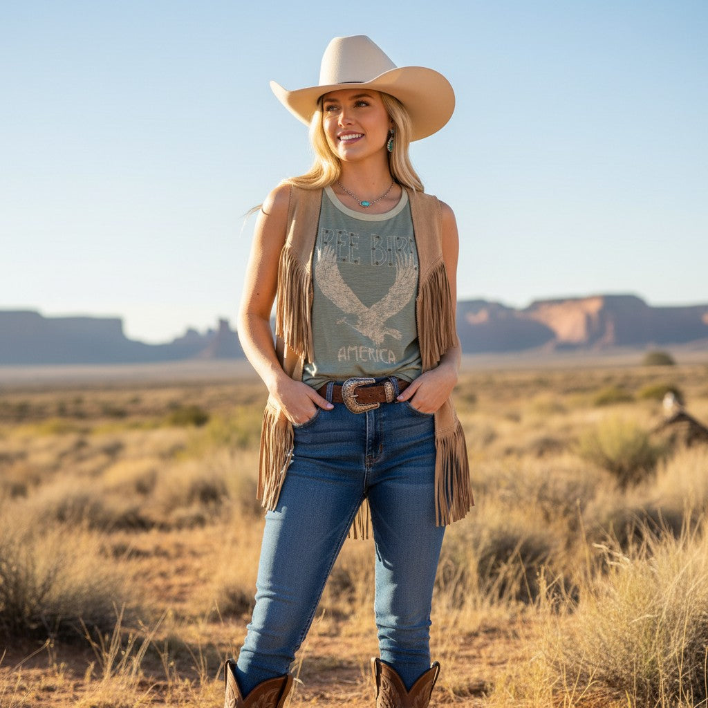 The relaxed, flowy silhouette makes it easy to wear on warm days, while the lightweight rayon-cotton blend keeps it soft and breathable. It’s the kind of tank you throw on for concerts, rodeos, road trips, or just an easy afternoon when you want something that feels a little western and a little wild.
