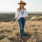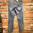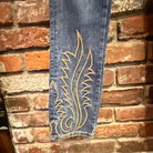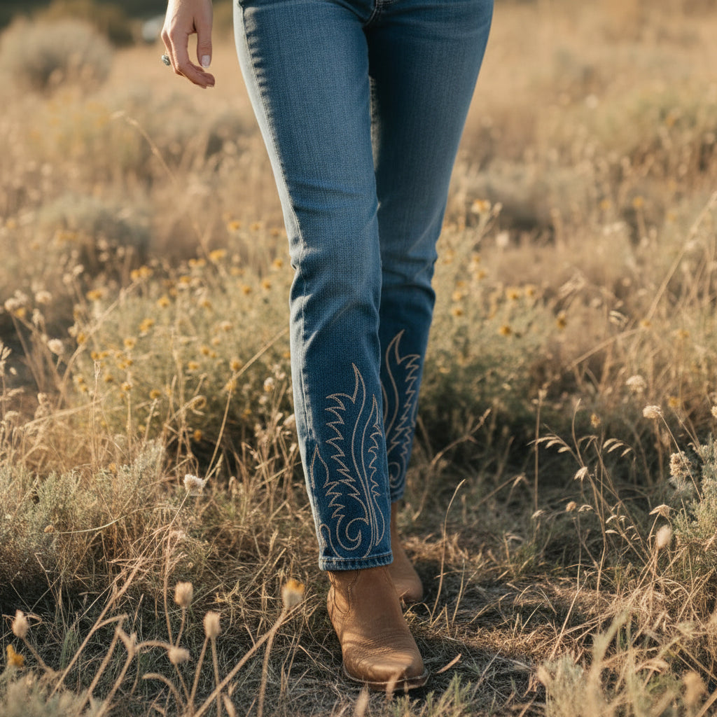 Bold Western flame stitching rises from the bottom of each leg in warm, sand-toned thread, creating a striking contrast against the denim. The placement elongates the leg and frames the flare with intention. It feels powerful. Defined. Confident.