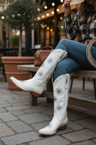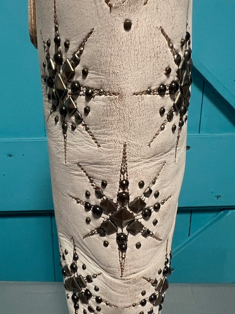 A standout blend of Western charm and celestial detailing, this stunning 15" boot now comes in a beautiful rustic beige finish. The soft, vintage-inspired leather highlights the intricate star-studded designs that make this style truly unforgettable.