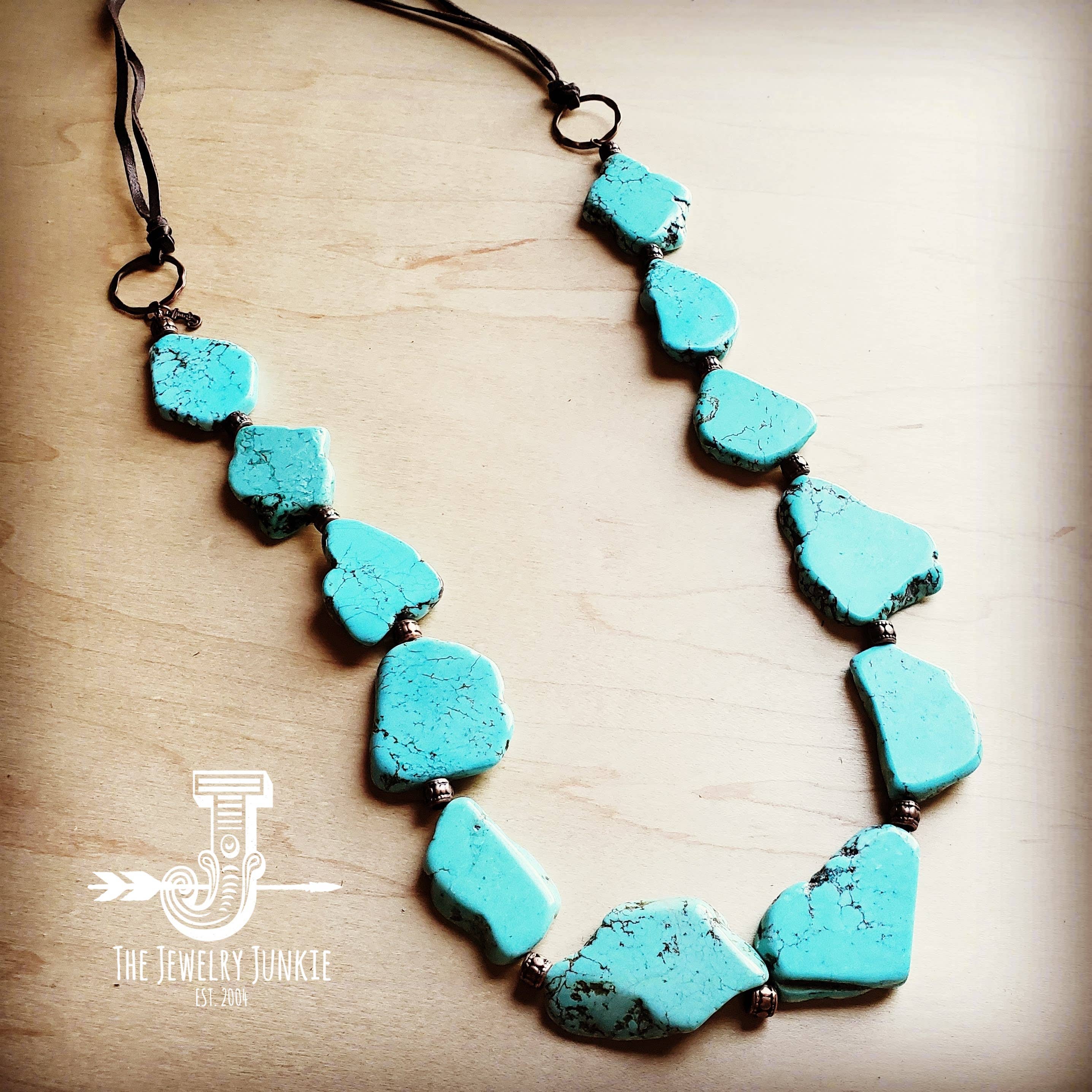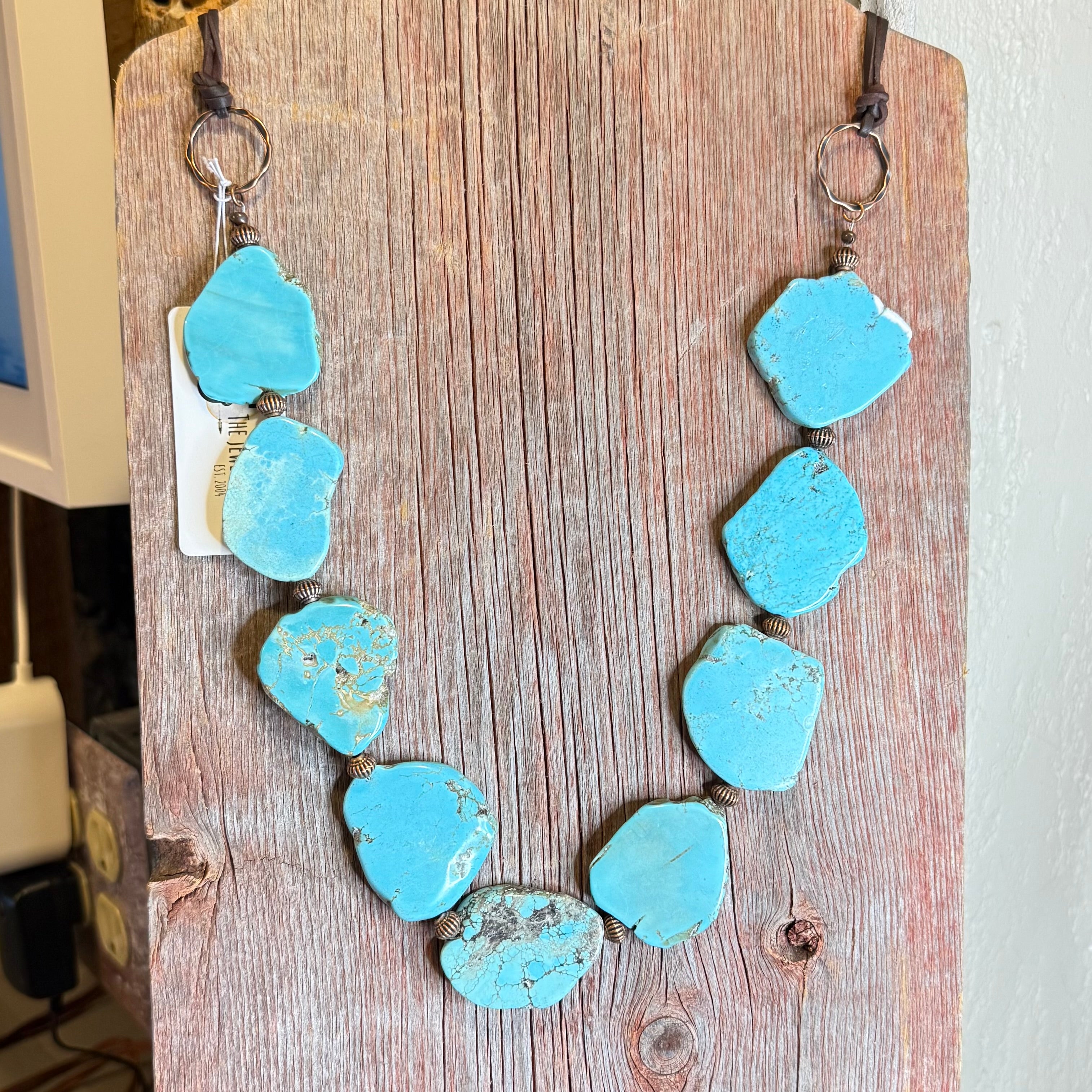 Wide Open Blue Turquoise Slab Necklace with Genuine Leather Ties