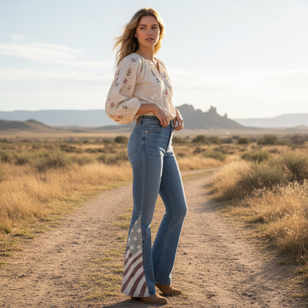 These jeans make their statement quietly, then all at once. A classic high-rise fit through the waist and hips, balanced by a clean flare that opens at the hem. Turn to the side and the Americana flag panel comes into view. Unexpected, bold, and grounded in vintage energy rather than novelty.