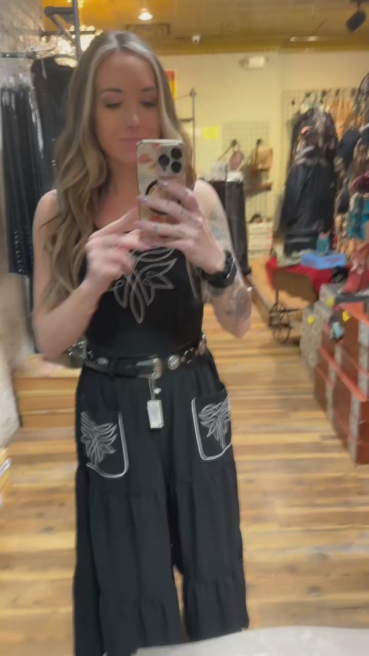 Set against a solid black base, the contrasting white bootstitch embroidery adds striking visual interest throughout. From the cropped tank’s centered stitch motif to the oversized embroidered patch pockets on the pants, every detail is thoughtfully coordinated for a cohesive, boutique-ready outfit.